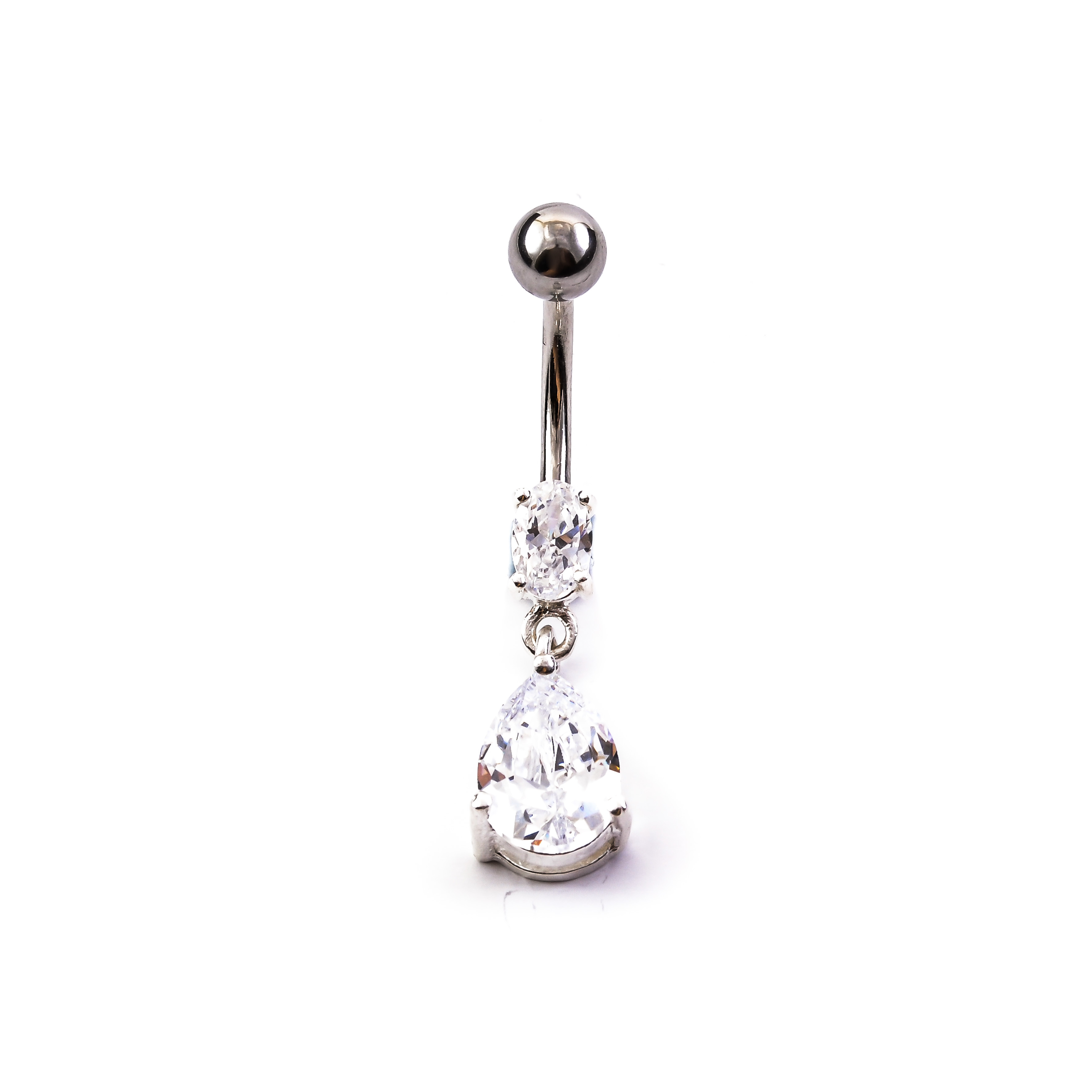 Dangle belly bar, embellished with dazzling cubic zirconia.