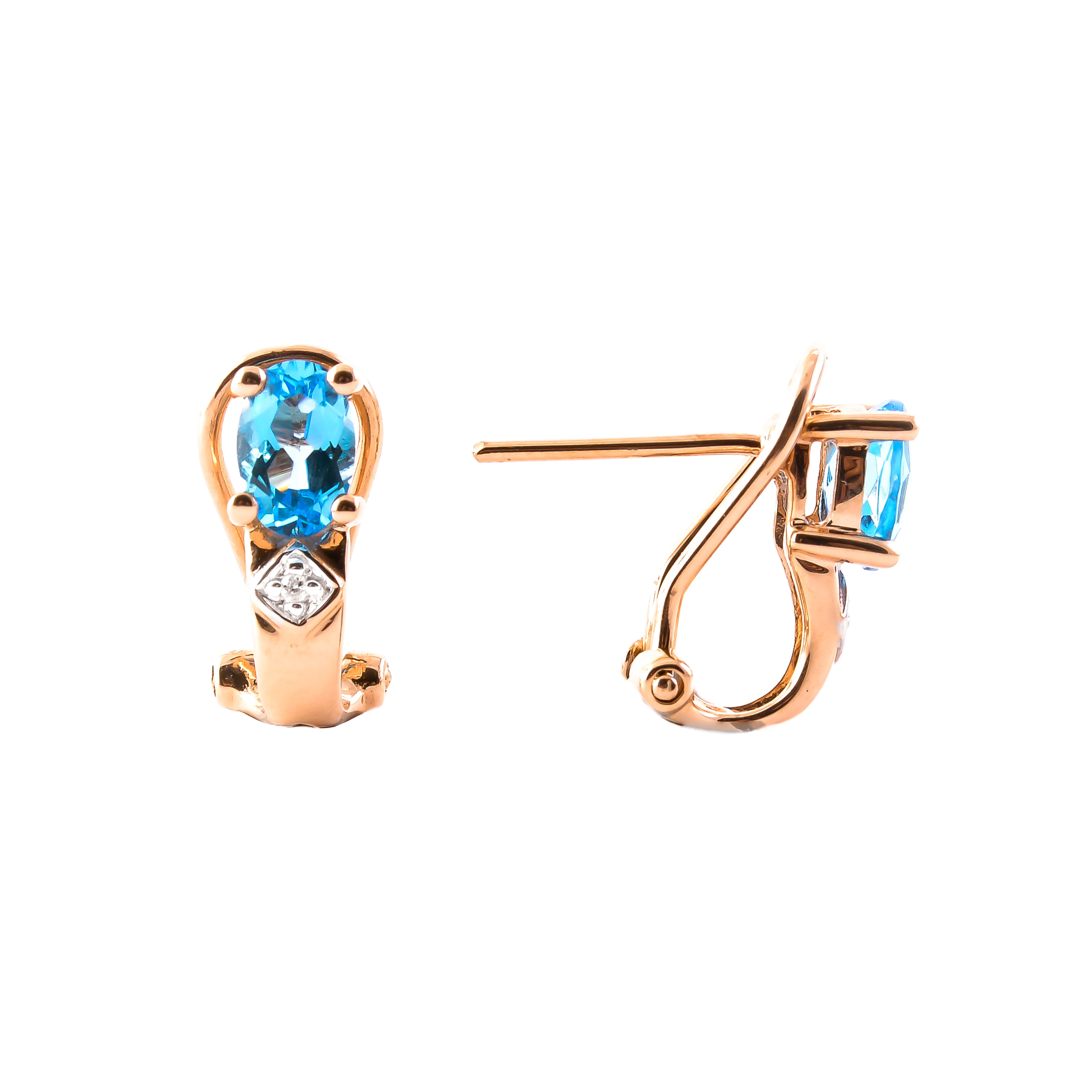 Золотые серьги с замком омега, инкрустированные бриллиантами и топазами овальной огранки. Эта классическая и элегантная модель вне времени и всегда будет выглядеть актуально. Изделие имеет сертификат качества Латвийской Пробирной Инспекции.