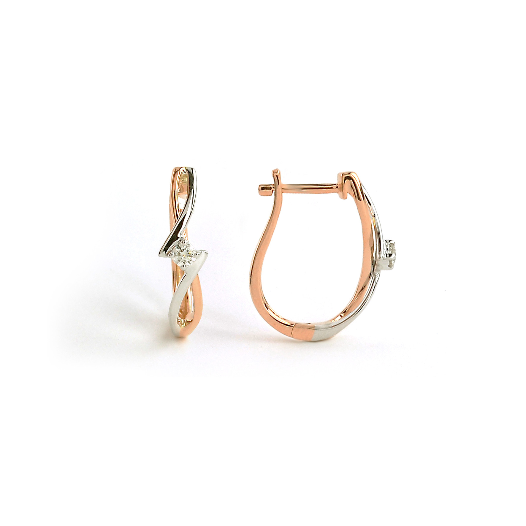 Divu toņu zelta auskari ar briljantiem. Produktam ir Latvijas Proves Biroja kvalitātes apliecība