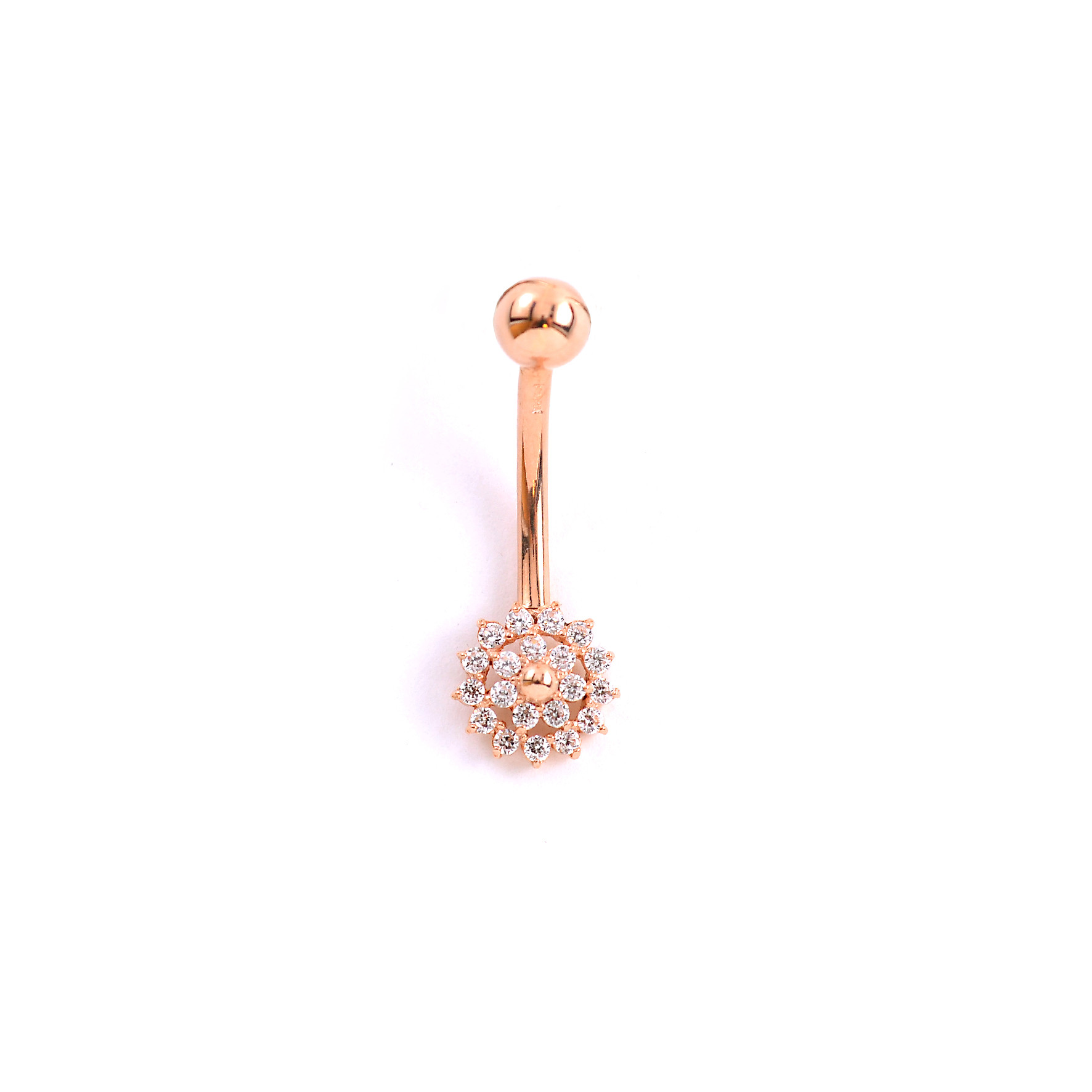 Spindintis žiedas į bambą, pagamintas iš raudono aukso ir papuoštas cirkonais, aureole apsuptos gėlės formos