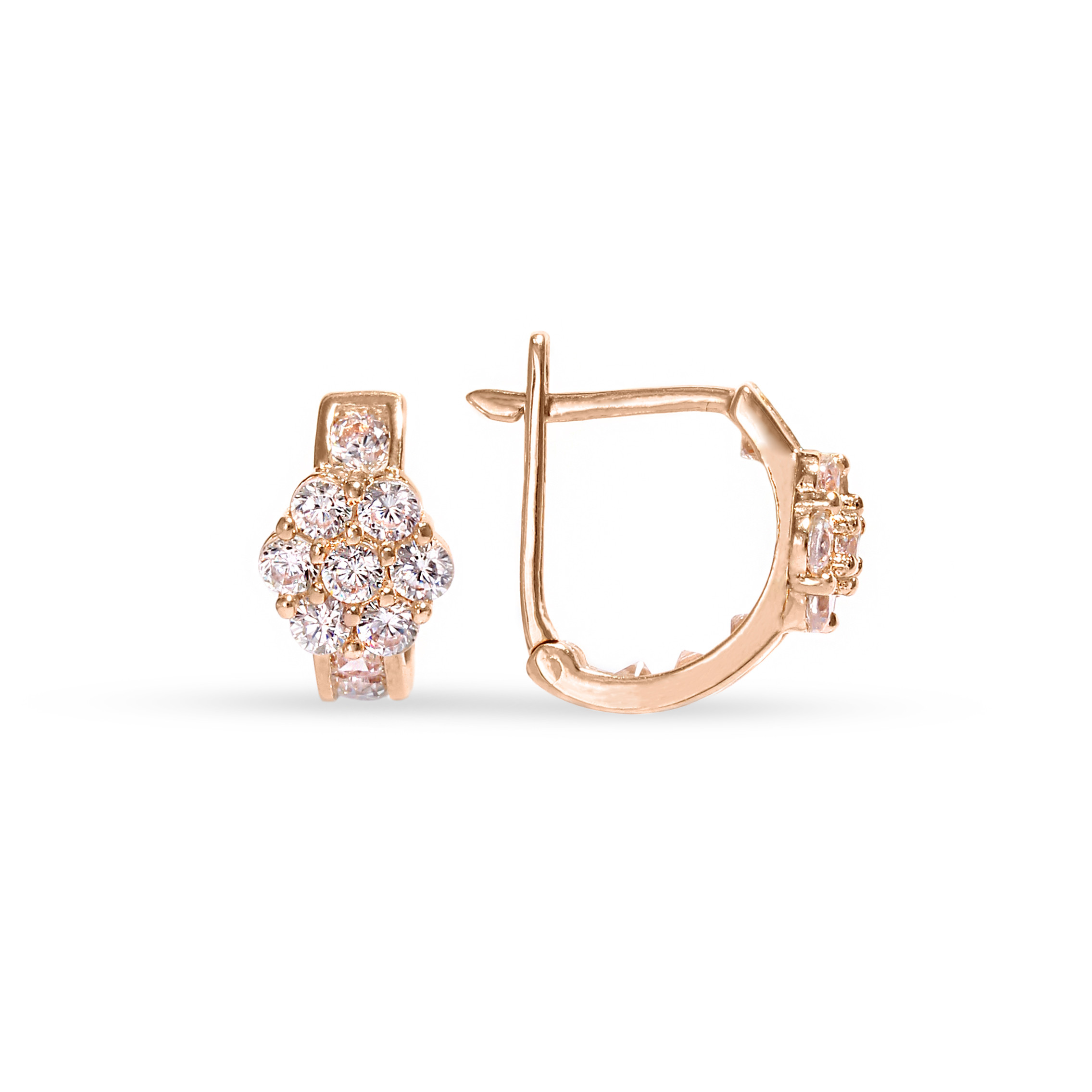 Серьги из красного золота с мотивом в форме цветка. Композиция из бесцветных кубических циркониев, расположенных вокруг центрального камня, создаёт эффект насыщенного сияния. Удобная застёжка обеспечивает комфорт.