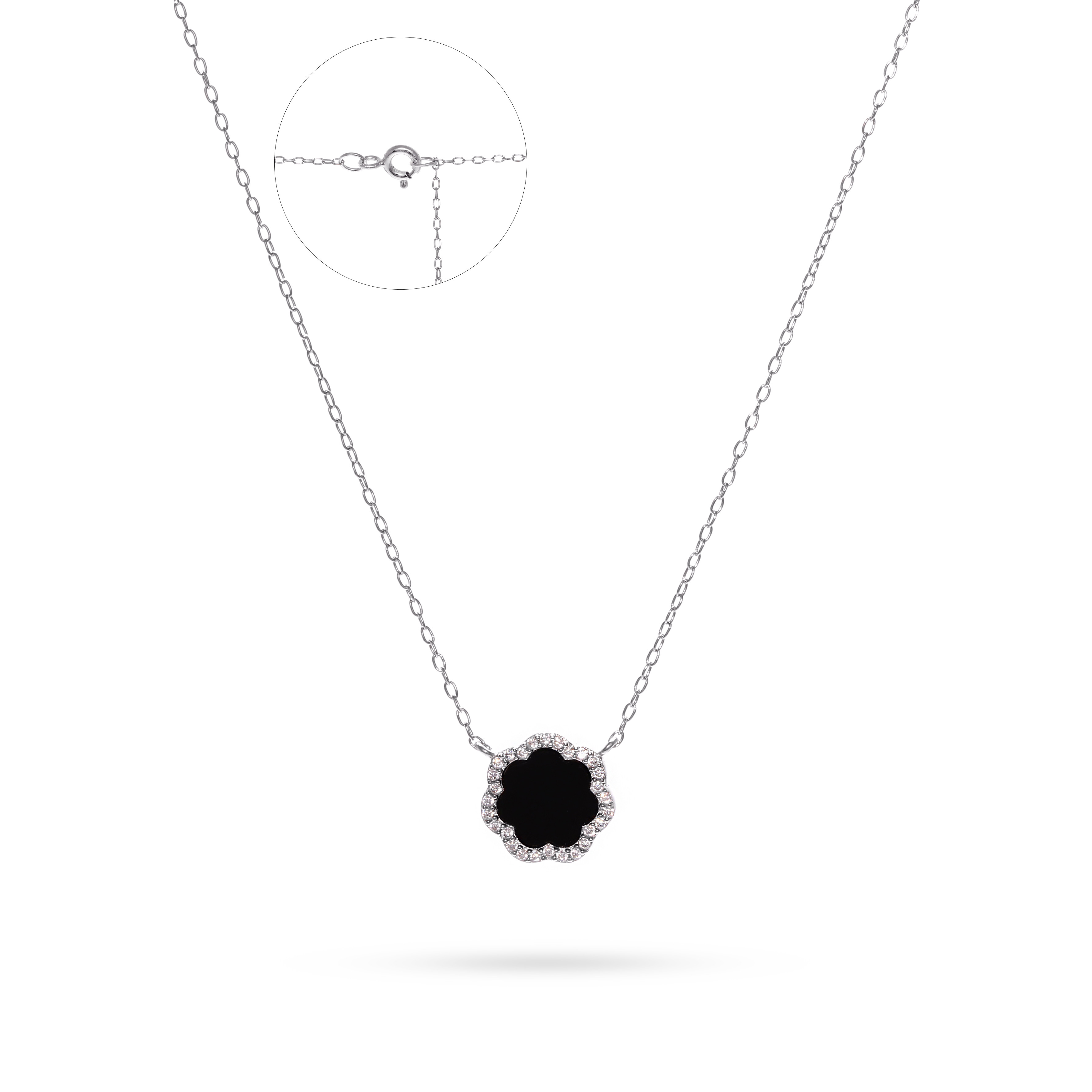 Silver necklace featuring a black flower-shaped pendant framed with colourless cubic zirconia.