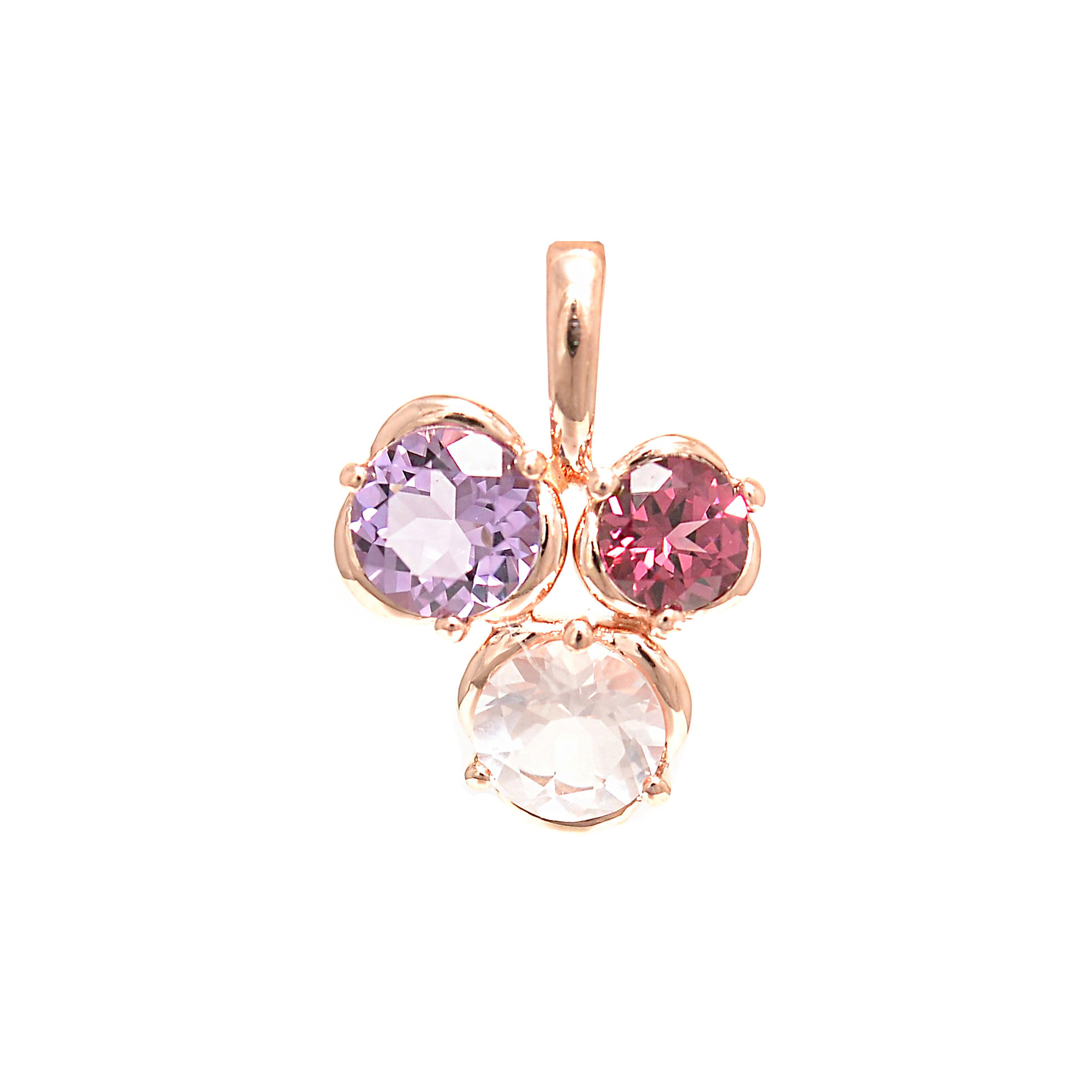 Gold pendant with amethyst, quartz and rhodolite