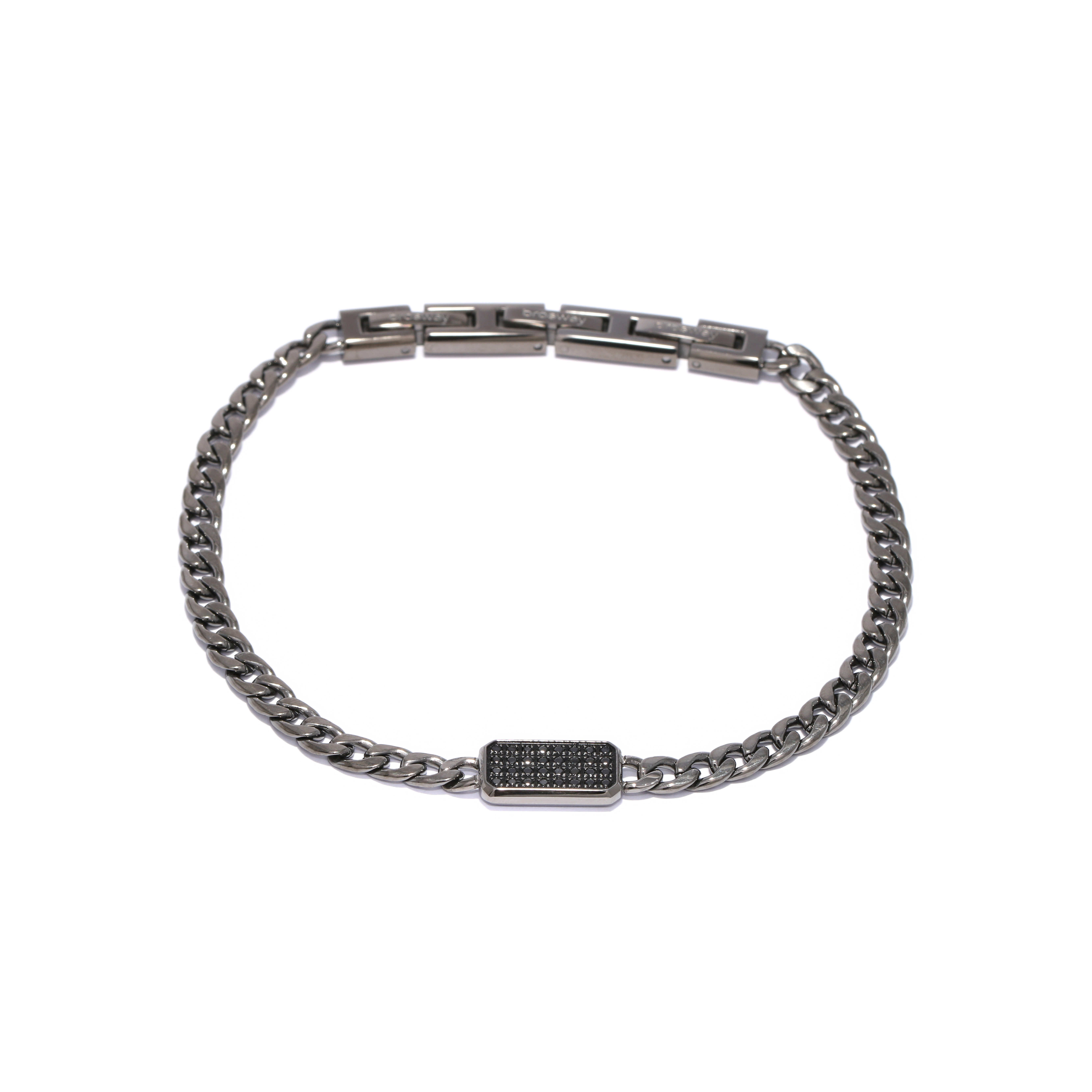 Stainless steel bracelet with ruthenium-colored PVD coating and black cubic zirconia stones.