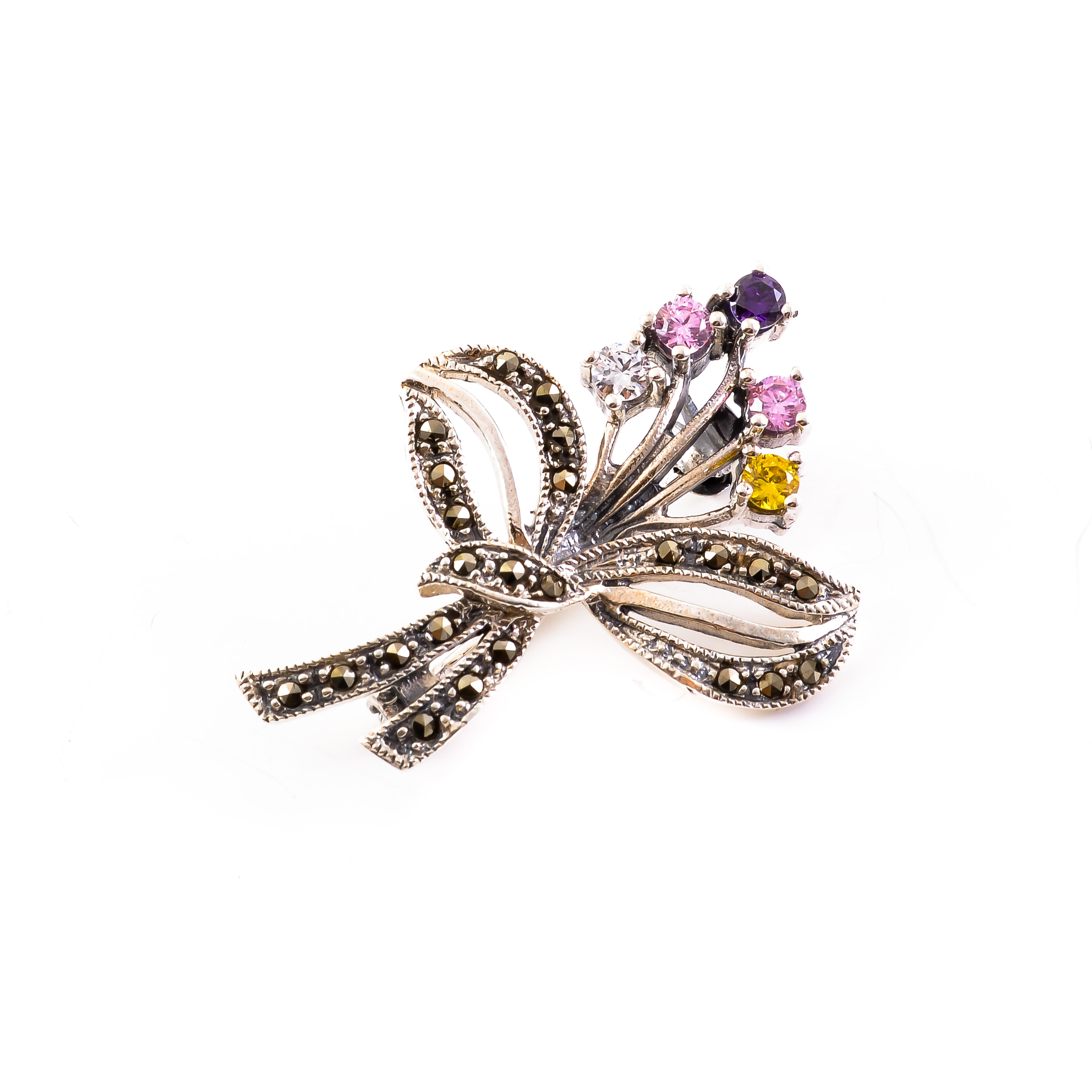 Sterling silver flower bouquet brooch, encrusted with multicolour cubic zirconia and marcasites.