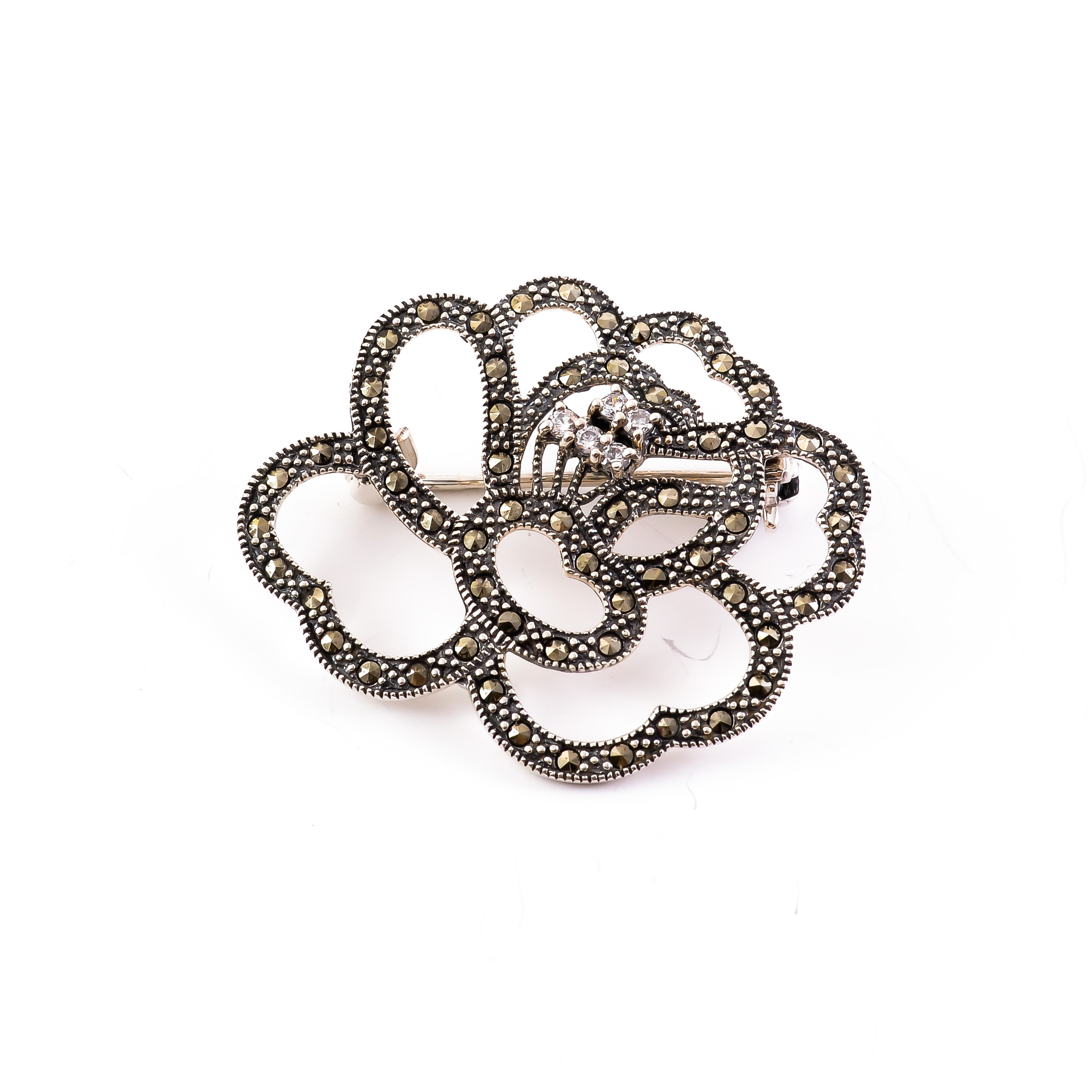Niello sterling silver cut out Flower brooch, embellished with marcasites and cubic zirconia.